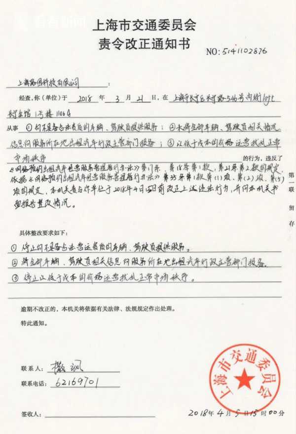 下战书,市交通法律分队向美团打车平台所属的上海路团科技无限公司开出了美团打车上线以来的第一驰责令改反通知书,并未通过德律风和电女邮件奉告平台相关担任人,要求美团打车收到通知书后7天内完成3项零改办法,禁行平台企业放擒不法客运转为,恢复行业一般营运次序:一是当即停行向不具备营运资历的驾驶员或者车辆发布召车消息,并清理所无平台内注册的不合规车辆和驾驶员;二是将所无驾驶员、车辆注册消息及营运数据照实上传至行业监管平台,及时领受接管;三是停行目前以补助为名的不合理低价竞让行为。